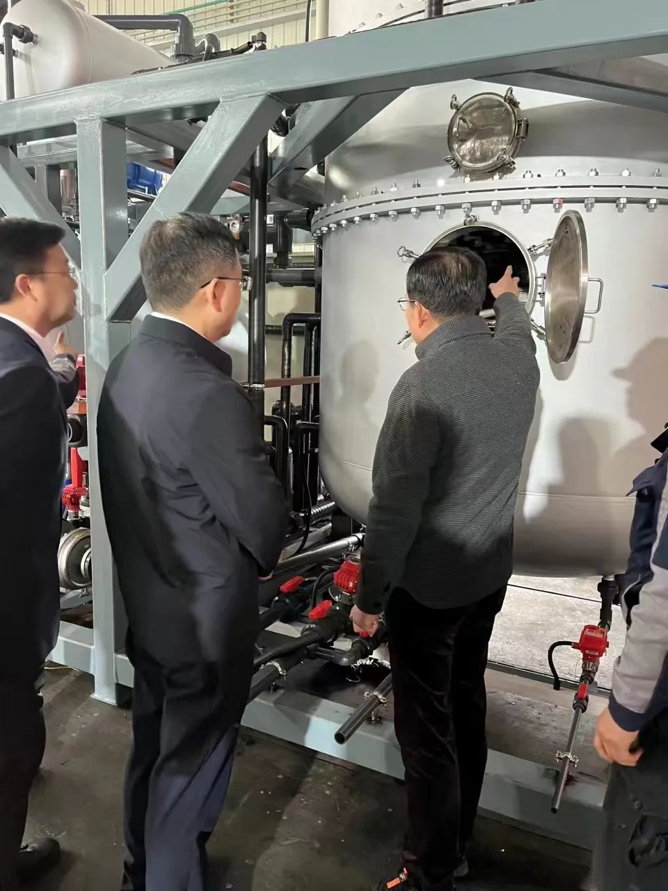 為進一步加強和促進朗盼環(huán)境的安全生產(chǎn)和消防工作,確保元旦假期間的車間安全生產(chǎn)形式穩(wěn)定、保障節(jié)后安全生產(chǎn)平穩(wěn)有序。12月30日,無錫市濱湖區(qū)區(qū)委書記孫海東、區(qū)長李平一行蒞臨朗盼環(huán)境進行了全面的安全檢查,并查看了解了我司自主研發(fā)的環(huán)保設備-低溫熱泵真空蒸發(fā)器。由我司董事長鮑偉東、總經(jīng)理鮑天鈺、鮑天鈞及車間安全生產(chǎn)管理員進行接待講解。