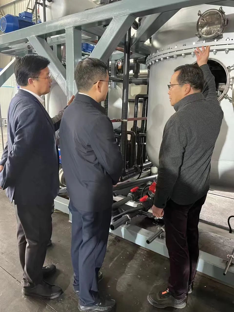巡查工作結束后,孫海東查看了朗盼環(huán)境自主研發(fā)的低溫熱泵真空蒸發(fā)器。鮑偉東向其介紹了公司產(chǎn)品的應用領域、發(fā)展現(xiàn)狀以及發(fā)展規(guī)劃。鮑偉東說:低溫熱泵真空蒸發(fā)器是朗盼環(huán)境自主研發(fā)的工業(yè)污廢水處理環(huán)保設備,產(chǎn)品應用領域廣泛,包括各大金屬加工、機械加工、垃圾滲濾液、印刷印染、化工制藥等行業(yè)的工業(yè)廢水。我司在工業(yè)污廢水處理領域積累了豐富的技術沉淀和經(jīng)驗,未來很期待與無錫市各大工業(yè)生產(chǎn)企業(yè)展開有深度的合作,為構建我市的綠色低碳環(huán)保的現(xiàn)代產(chǎn)業(yè)體系貢獻企業(yè)力量。